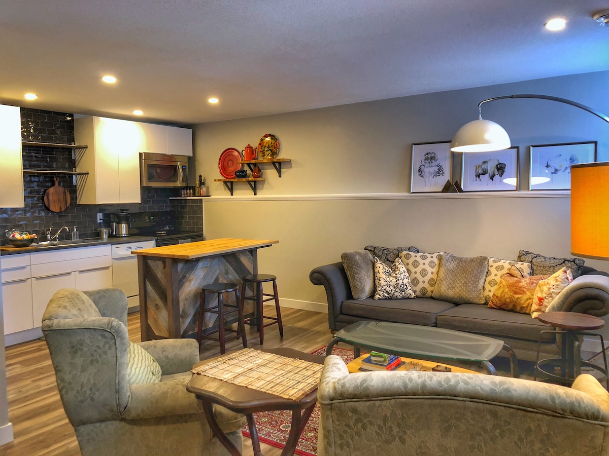 ¡Estarás en las montañas en una hora! Salga de la suite del sótano con entrada privada, mucho aparcamiento en la calle, en un barrio tranquilo a 3 minutos de tiendas y restaurantes, perfecto para parejas, amigos o familiares. Aire acondicionado para el verano y calefacción por suelo radiante en invierno para un confort total. Cocina bien surtida con horno tostador de convección/freidora de aire y quemador de inducción doble con ollas y sartén. Hay muchos asientos en la sala de estar y el comedor, lo que hace que este elegante lugar sea perfecto para grupos. Lavadora/secadora disponible bajo petición.
