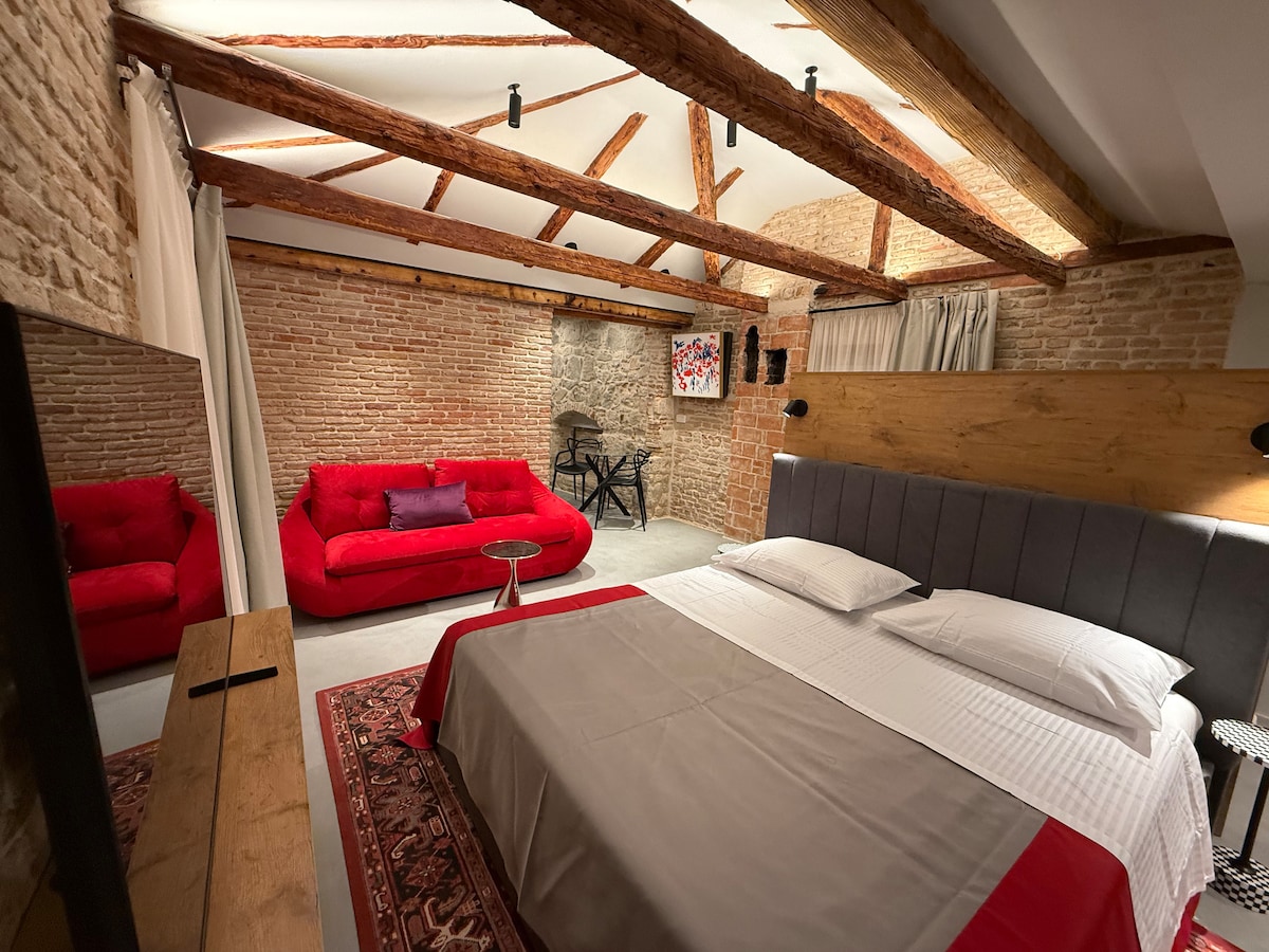 Despiértate bajo las vigas a la vista de los techos de madera centenarios. Déjate seducir por los toques antiguos, las escaleras de estilo industrial y los finos acabados ubicados detrás de los enormes arcos internos de piedra del Palacio Imperial. Después de explorar las delicias de Split, donde las piezas del museo adornan una paleta de arena y tonos tierra apagados, bebe una copa de vino en el balcón de este loft único, empapado de historia.