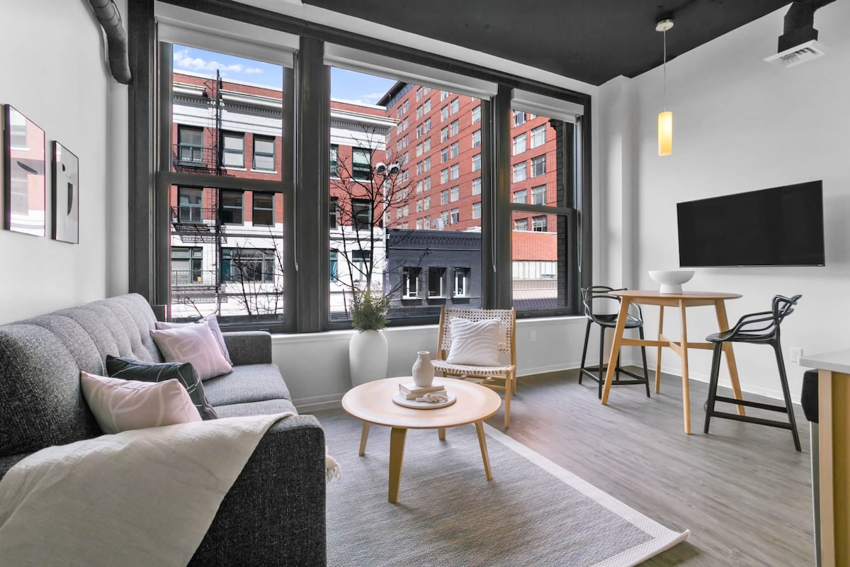 Welcome to J&K on Main! - Thoughtfully renovated with high-end finishes. - Decor and features worthy of any design-admirer’s dream. - Luxury Memory Foam King beds + sleeping for 1 on the couch. - Shared pool table room for socializing. - Fast Business class Wi-Fi and Smart TV - Fully stocked kitchen and in-unit laundry. - Paid secured parking garage nearby ($30+/day which is standard for downtown.) - Convenient distance to Spokane’s best dining, shops, bars, and cafes.