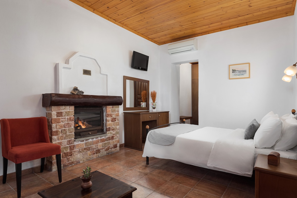 La sala familiar de Dohos Skiathos Suites es un espacio lleno de hermosos toques. Cuenta con camas cómodas para un sueño reparador, junto con un pequeño refrigerador y una máquina de café para disfrutar de los pequeños momentos de tu día. La hermosa vista de la isla, desde tu habitación, el jardín y el estacionamiento gratuito, sin duda facilitan tu experiencia en esta hermosa isla. El puerto, el aeropuerto y la playa de Xanemos están a poca distancia en auto.