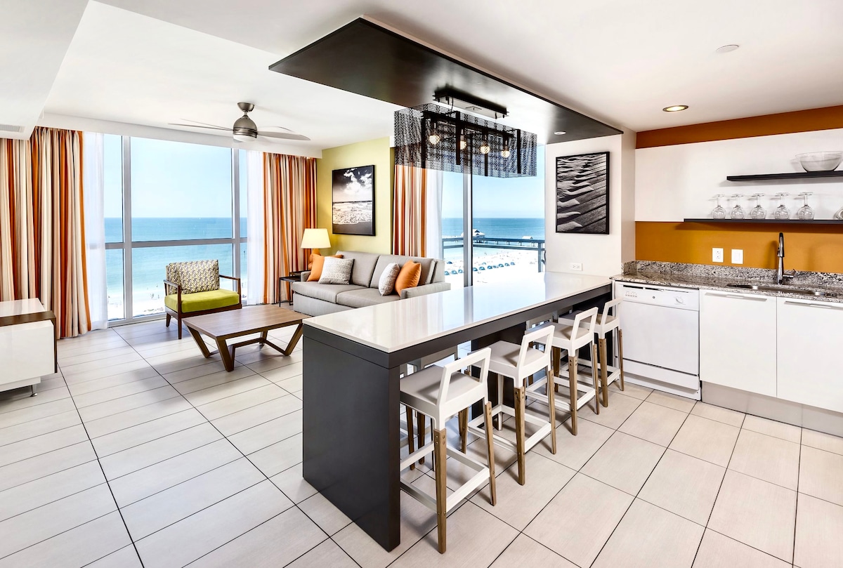 Esta moderna y elegante suite de hotel de 3 dormitorios, 2 y 2 baños ofrece impresionantes vistas de la bahía, la isla Honeymoon y Dunedin. Tiene capacidad para 8 personas con una cama tamaño king, 2 camas queen y un sofá cama de tamaño completo. El balcón privado proporciona el lugar perfecto para que la gente vea en la calle de abajo y hacia el sur, por Mandalay Ave., o para disfrutar viendo el amanecer sobre Mandalay Bay. Ten en cuenta que una de las habitaciones tamaño queen no tiene ventana.