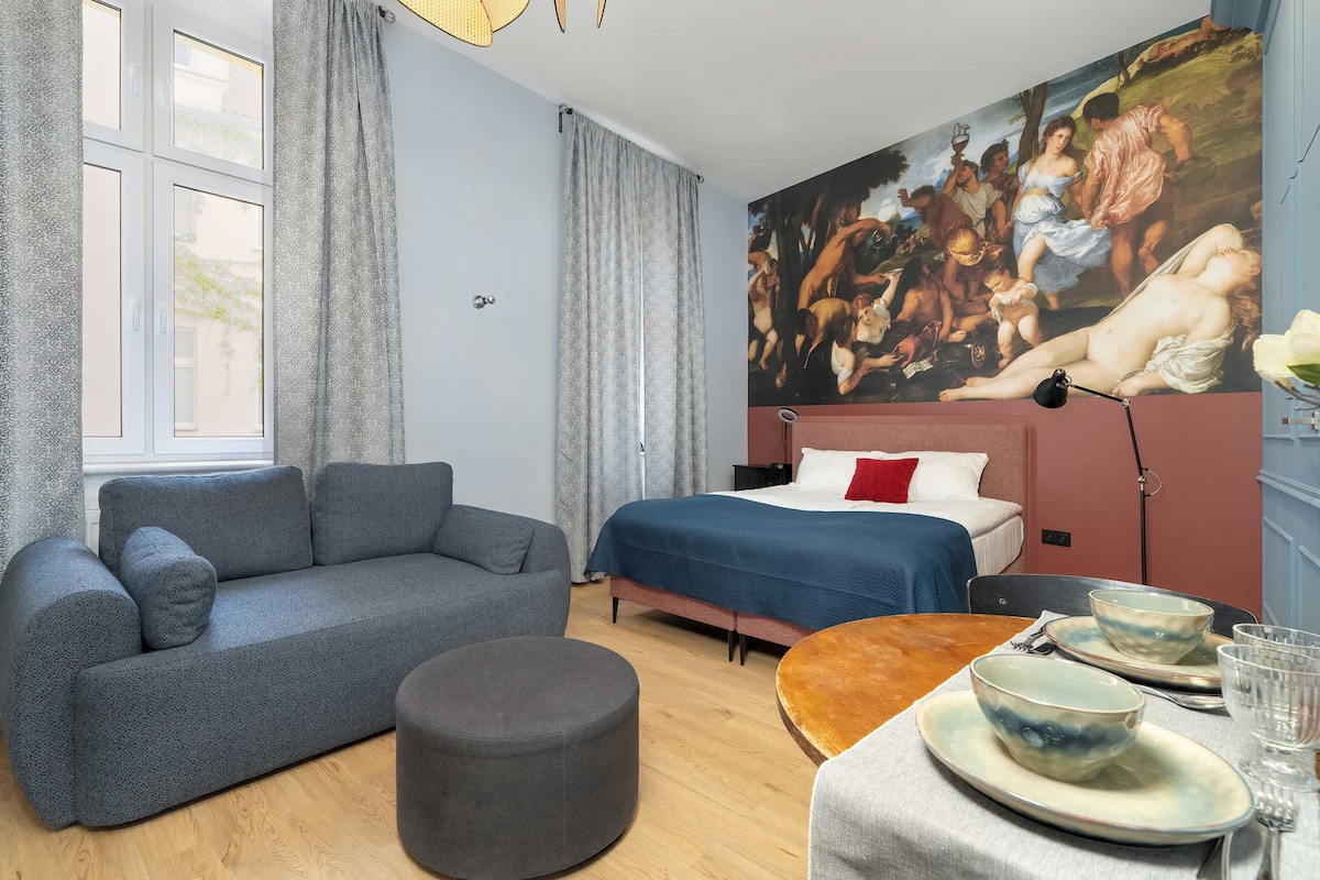 Un apartamento de lujo en el corazón de Poznań. Rodeado por los monumentos del casco antiguo. Cultura, vida nocturna, bares y restaurantes justo al lado del lugar. Además de esta conveniente ubicación, el apartamento también ofrece habitaciones cuidadosamente decoradas, hermosas y elegantes. Hay un dormitorio con una cama grande y una sala de estar con sofá cama. También tiene una cocina totalmente equipada y un baño privado. El equipo incluye todo lo que necesitas para pasar un tiempo inolvidable en Poznań.