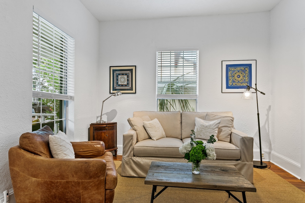 Casa de campo increíblemente renovada que combina comodidades modernas con encanto vintage... * 2 suites principales con camas tamaño queen. * Barrio tranquilo a poca distancia a pie para explorar la ciudad más antigua de la nación. * Bañeras con patas por dentro y por fuera (¡junto con las duchas, por supuesto!) * Gran porche con mosquitero y sofá cama colgante. * Estacionamiento pavimentado fuera de la calle. * Patio trasero completamente cercado, parrilla Weber, fogata de gas. * Wifi rápido y TV inteligente * A 2 cuadras de Fish Camp, Ice Plant, LaNuvelle, parada de tranvía. * A 10 minutos a pie del centro de la ciudad