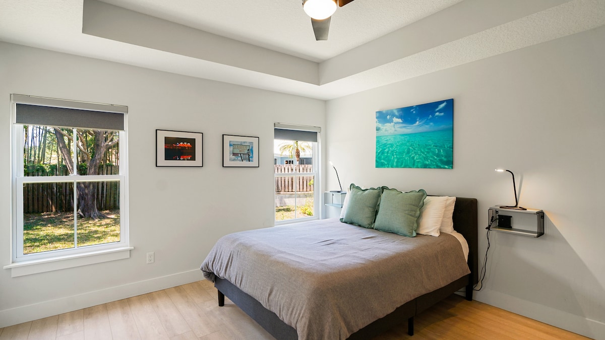 Bungalow Sea-Glass. Retiro tropical y tranquilo. ¡Todos son bienvenidos aquí! Siente cómo tus preocupaciones se desvanecen mientras la brisa tropical susurra en el jardín privado, disfruta de características únicas como hamacas colgantes y porche protegido. Este espacio único tiene personalidad propia. Los detalles artísticos resaltan este garaje convertido en un estudio moderno. Cuando no estés relajándote en este oasis tropical, explora el faro, la granja de caimanes y observación de aves, las playas de arena blanca, The AMP y el centro de la ciudad, todo esto a menos de 1 milla de distancia.