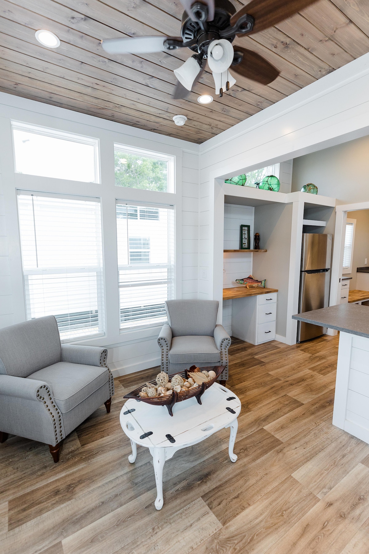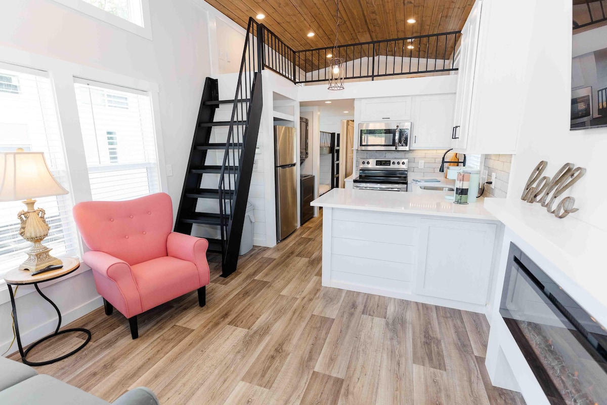 Welcome to the Horseshoe model Tiny Home at Rivers Edge Marina. With a unique kitchen space and roomy living room. This Tiny home does everything but make it feel small.