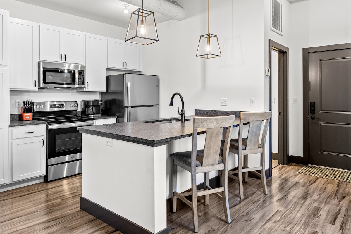 El Echelon es un magnífico loft de 1 dormitorio/1 baño diseñado con buen gusto con techos de 12 pies + ventanas de marco de acero de 7 pies y una cocina totalmente equipada. Comienza tu estancia con un café recién hecho y un bocado del minimercado de abajo. Pasa la tarde descansando al sol junto a la piscina o desafía a tus amigos en la terraza de juegos de la azotea. Asa algunos perritos al atardecer y toma un corto viaje en Uber al estadio para un juego de Cards, o mejora con filetes en Carmine's y un espectáculo en el famoso Fox Theatre