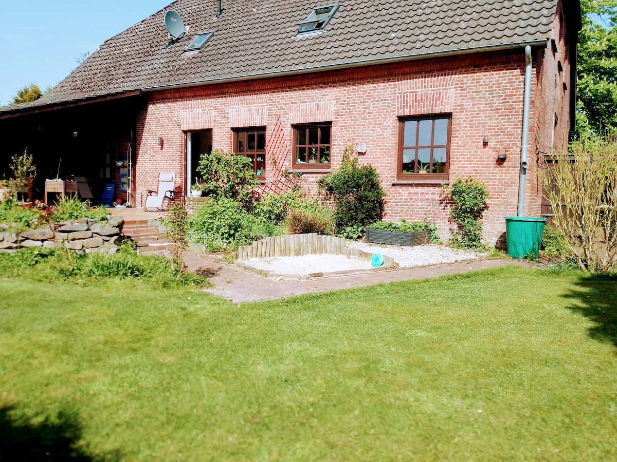 Relajación pura (para toda la familia): vives en un apartamento de 125 metros cuadrados en el sótano de una encantadora casa, catalogada y renovada en 2021 en el antiguo centro del pueblo de Rodenkirchen, en el Wesermarsch (Baja Sajonia). La parcela de 1600 metros cuadrados, que puedes utilizar por completo, está rodeada de árboles viejos, crecimiento silvestre y mucho espacio abierto para jugar, acampar o celebrar. El espacio para 4 adultos y 3 niños se da sin problemas. Moin moin y 'Bienvenido'...