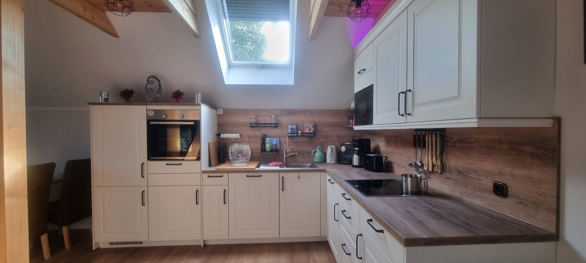 Apartamento en el ático a 20 minutos en coche de Potsdam y Berlín y a 30 minutos en tren de BER. Amplia cocina de diseño totalmente equipada*, baño con bañera Agape Vieques y lavabo a juego*, dormitorio con cama de 2,70 m*, el gimnasio se puede utilizar como segunda zona de dormitorio. Aquí hay una cama doble de 1,80 m*Proyector con aplicación preinstalada para NETFLIX, Disney + y Amazon Prime, juguetes, supermercado con panadería y carnicería, mercado de bebidas*Lagos de baño y senderismo