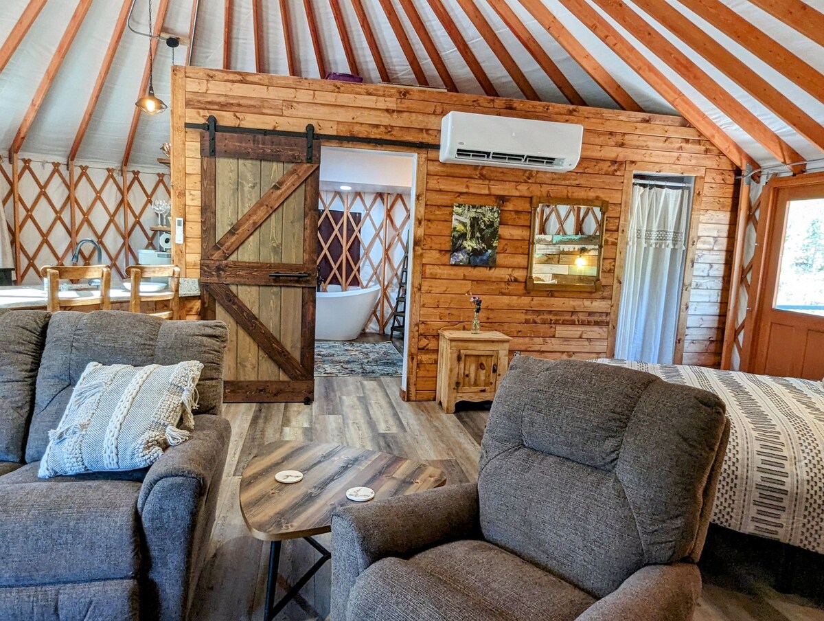 ¡Este lujoso entorno de yurta es la única yurta de la ciudad! Bellamente decorada con servicios atentos. La enorme terraza elevada ofrece las vistas más impresionantes y la experiencia interior/exterior más increíble que puedas imaginar. Lee un libro en la bañera de inmersión para dos personas, contempla las estrellas y disfruta de una noche relajante junto a la chimenea en la terraza. La escapada romántica perfecta o un viaje familiar por carretera. Pine tiene un bullicioso centro con fantásticos restaurantes y está a poca distancia en coche de muchas maravillas naturales.