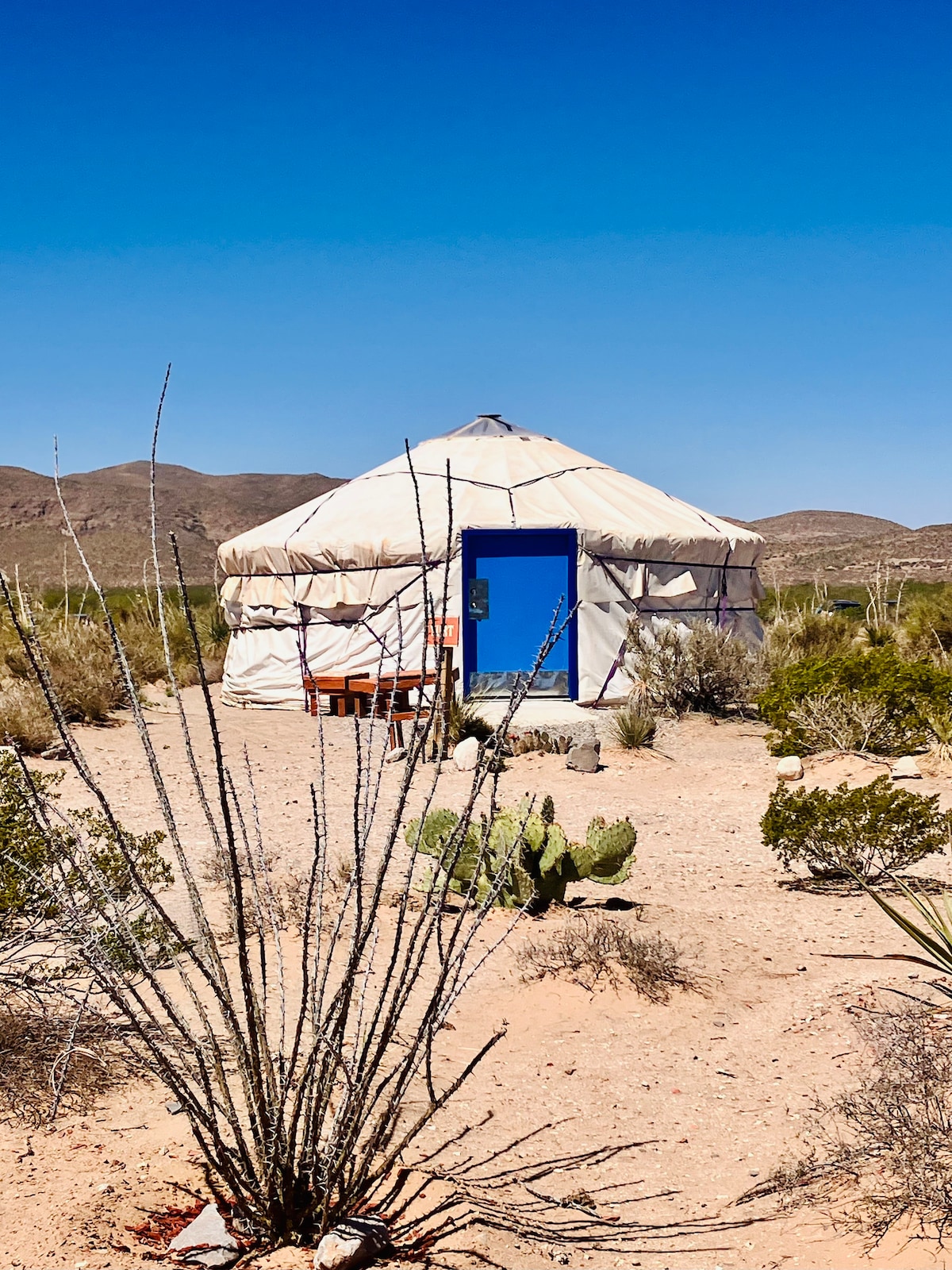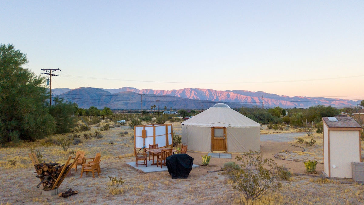 ¡Te damos la bienvenida a la yurta Borrego! Ofrecemos una experiencia única en el desierto en el corazón de la hermosa Borrego Springs. Disfruta de la serenidad de esta espectacular zona y duerme cómoda y sosteniblemente. La yurta funciona con energía solar y todos los servicios están diseñados pensando en nuestro planeta. Si eres un campista experimentado o un amante de las escapadas de fin de semana, nuestra yurta te proporcionará una estancia inolvidable. Situada cerca del centro de la ciudad. El punto en Airbnb no es exacto para respetar la privacidad de nuestros vecinos.