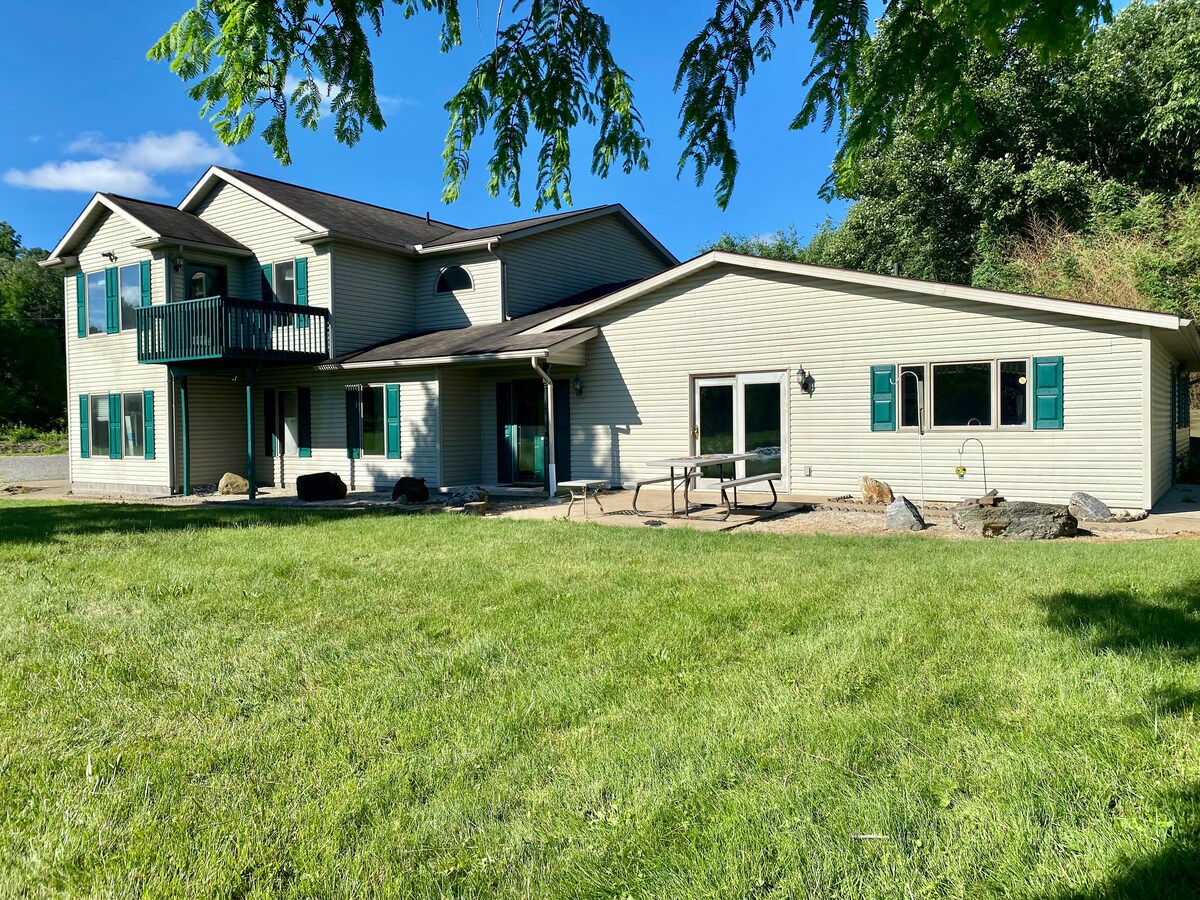 The perfect getaway for your large or small gathering. Relax at our outdoor bar and hot tub, perfect for a adult getaway or a family weekend. Overlooks the lake for beautiful sunsets. Looking for an adventure? Canton air sports is just across the road, or just enjoy watching someone else sky dive right above the house. Only miles from the highway and many restaurants, 20 minutes from the Football hall of fame.