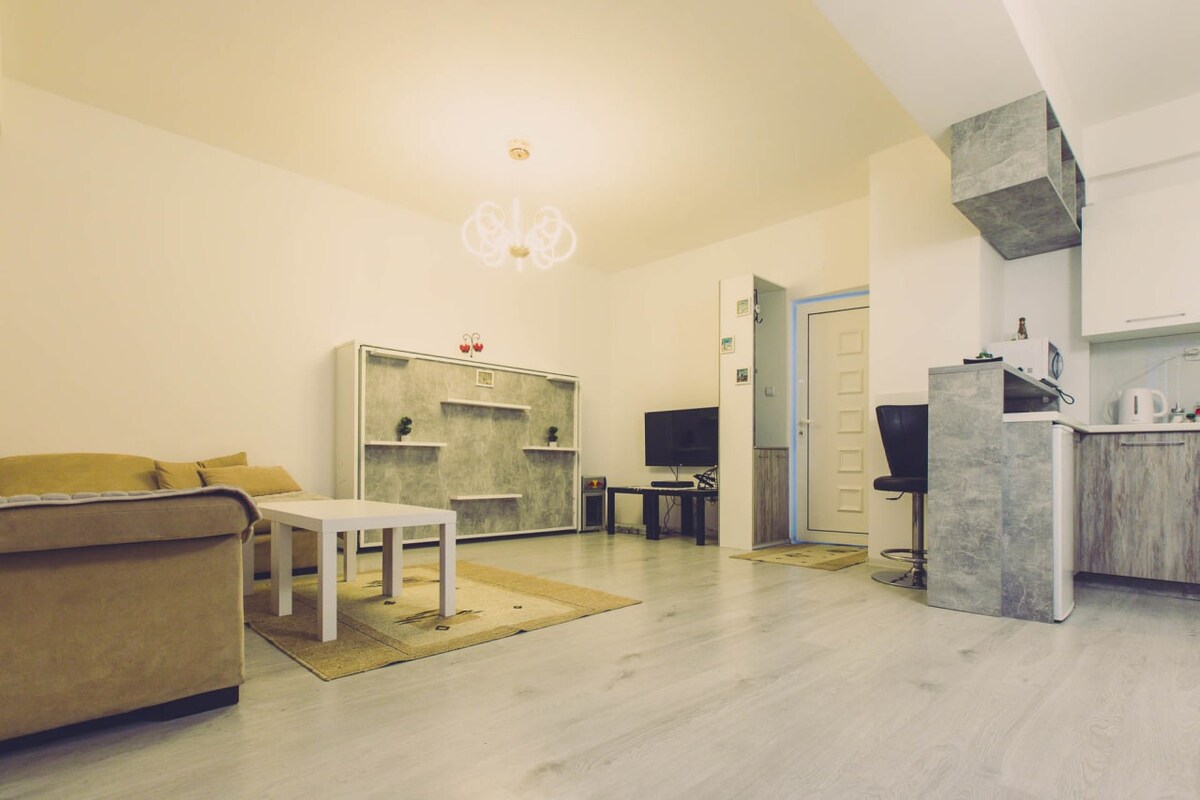Relájate en este espacio tranquilo y elegante. Un dormitorio recientemente renovado separado de la sala de estar, cocina de tamaño adecuado y un baño. A solo un minuto a pie de la estación de autobuses más cercana, a 15 minutos en auto del centro de la ciudad y estacionamiento GRATUITO disponible las 24 horas del día, los 7 días de la semana, para tu auto. Esto es el lugar perfecto para pasar tu tiempo en Skopje.