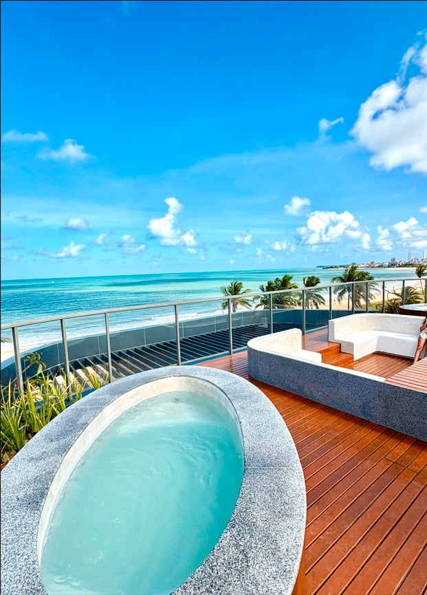Piso en el punto más oriental de las Américas, frente al mar, jacuzzi privado, aire acondicionado central, recepción 24/7, checkin/checkout fácil, extrema seguridad para los huéspedes con sistema de huellas digitales de ambiente a ambiente, gimnasio, lavadora/secadora, garaje rotativo, sala de reuniones y estudio, azotea impecable con 2 gourmet, jacuzzis, piscina con borde infinito, una vista divina y tranquila. Asegúrese de vivir la mejor experiencia en el más alto nivel de JPA.