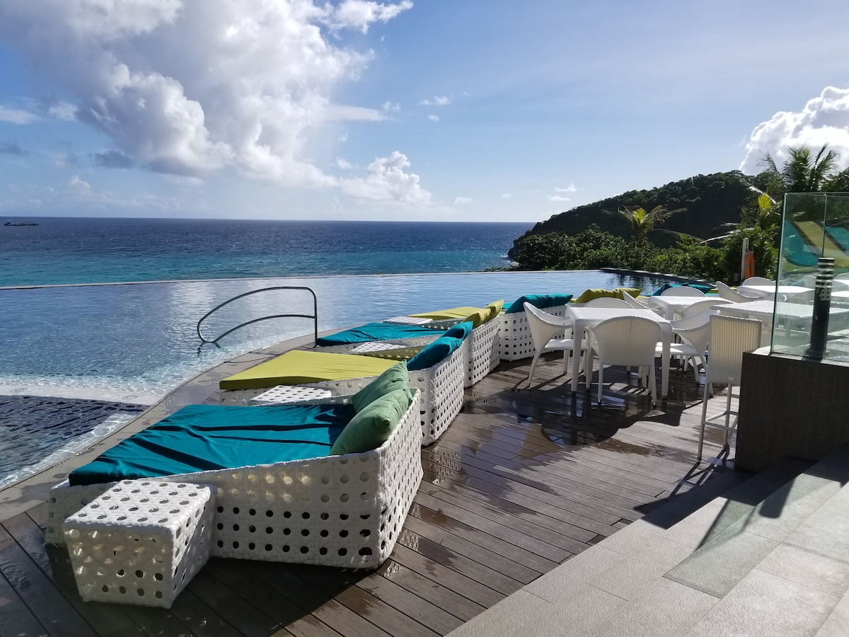 Absoluto frente a la playa con habitaciones tipo estudio con vista al mar y cocina Los siguientes elementos están incluidos en las habitaciones: * Cama tamaño king. *Sofá cama * Toallas y ropa de cama *Aire acondicionado *Ducha fría y caliente. * TV por cable LED de pantalla plana de 43 pulgadas. * Wifi las 24 horas. * Cocina y refrigerador