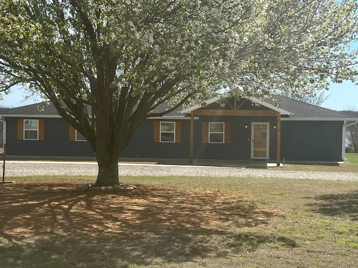 Accesible para discapacitados, 985 pies cuadrados totalmente remodelados. Paredes de madera de 16 pies. Techo abovedado con 2 ventiladores de techo grandes. Cocina pequeña, bar cafetería, baño con una gran ducha a ras de suelo, sala de estar abierta con sofás y sillón reclinable. Cama tamaño king. Colchón de aire disponible. Porche delantero cubierto y gran patio trasero. Los ciervos y los pavos vienen a menudo. Wifi y mucho aparcamiento con plazas cubiertas disponibles. A 7 minutos de Wal-Mart, a 5 minutos de restaurantes y a 3 minutos de una tienda de comestibles, todo en un entorno rural.