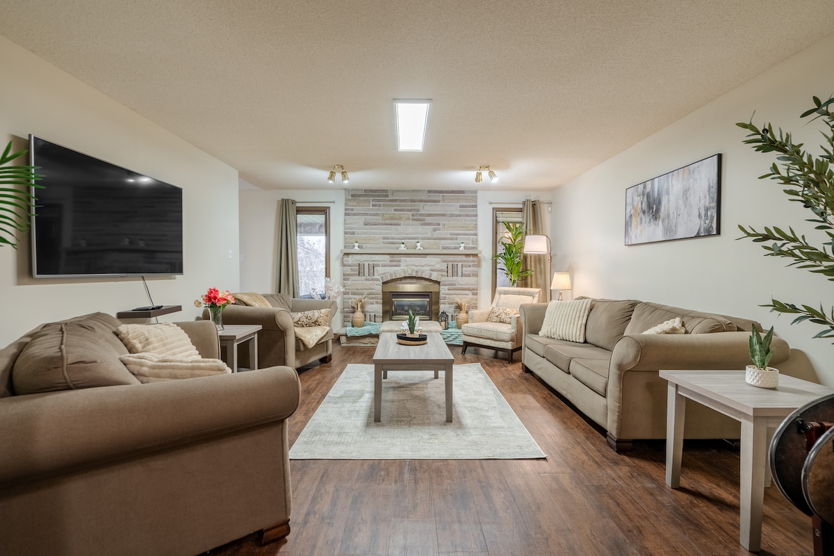 The entire home is exclusively yours during your stay, ensuring complete privacy with no other guests on the premises. Enjoy BBQs on the deck and unwind in the in-ground seating area. Immerse yourself in a cinematic experience with our 11-speaker Klipsch sound system, perfect for movie nights. Book now to unlock discounts at local restaurants and activities in town 2-minute walk to the park and 5 minute drive from Breslau airport