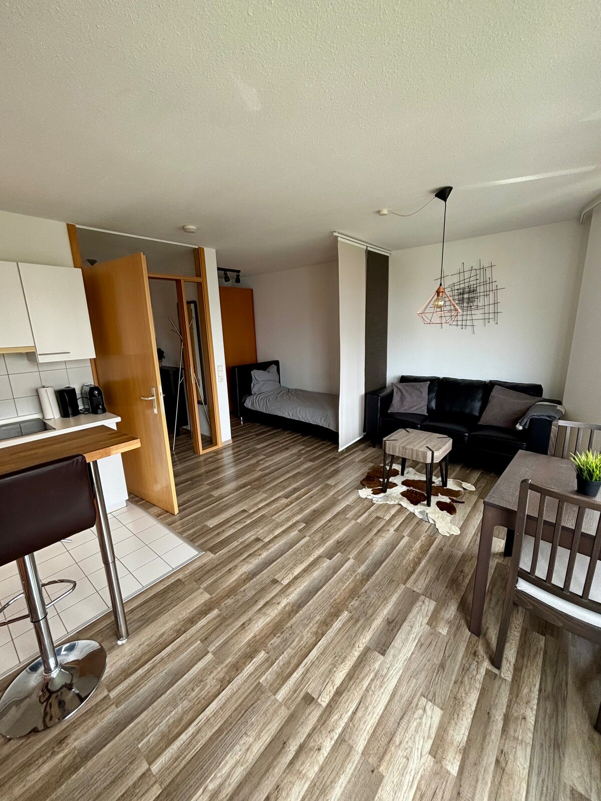 Llega y siéntete como en casa «¡Eso es exactamente lo que buscaba!» Nos gustaría que nos dijeras esta frase. Para lograrlo, hacemos todo lo posible y organizamos todo de forma rápida y sencilla. ¡Bienvenido a casa! El apartamento en sí está equipado con todos los electrodomésticos, desde una máquina Nespresso hasta una lavadora. El transporte público está a poca distancia a pie: se puede llegar rápidamente al centro de la ciudad de Stuttgart, así como a la feria comercial y al aeropuerto. A poca distancia a pie de tiendas, panaderías, restaurantes y bares.
