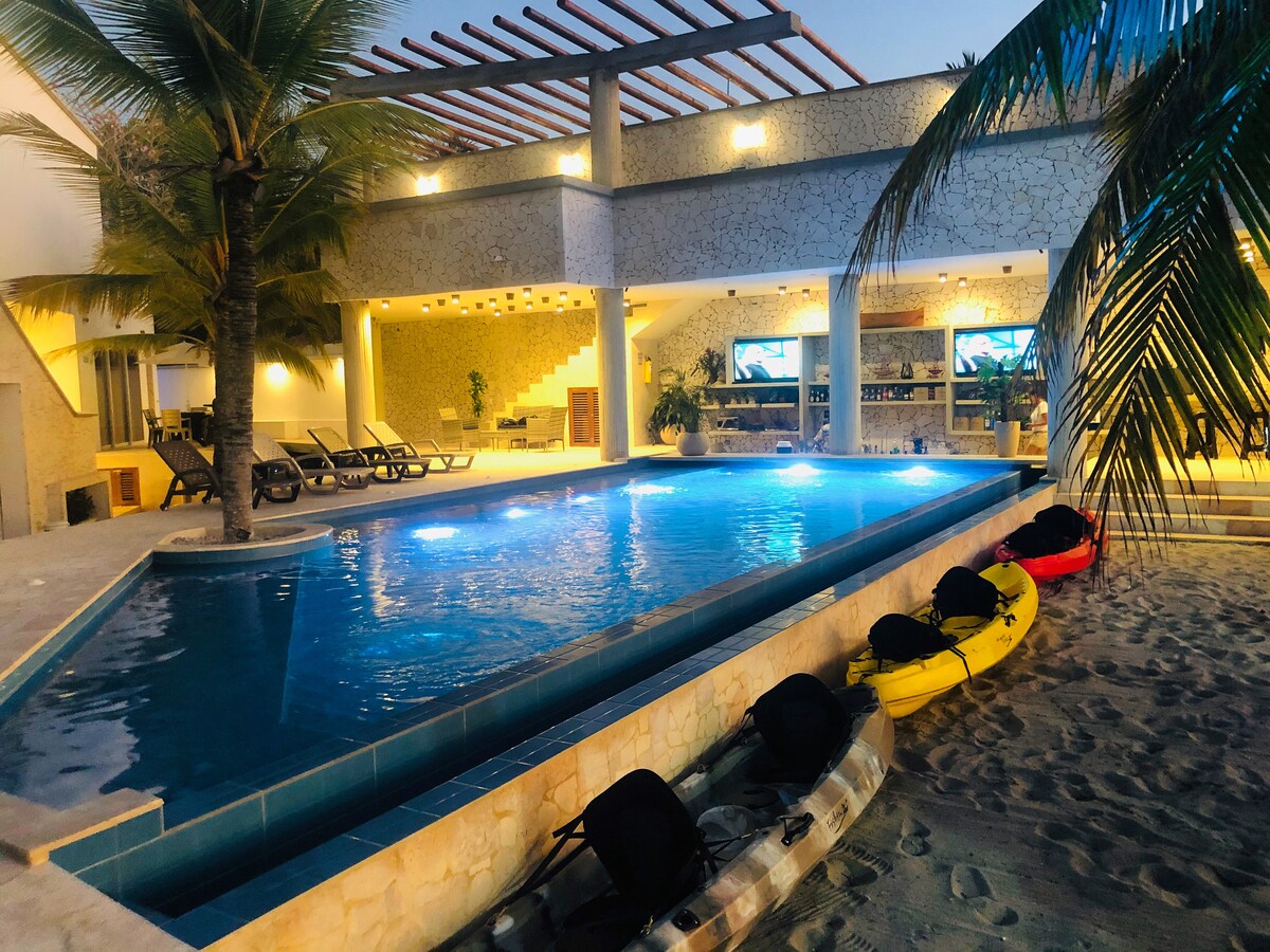 Hotel boutique en una exclusiva playa privada. Estarás hospedado en una villa con todas las comodidades y servicios de un hotel. Por sólo 60 mil pesos adicionalestendrás una anfitriona full time exclusiva para ti. Se encargará de hacer el aseo y cocinar para ti. Nuestras anfitrionas están capacitadas para dar un gran servicio con altos standares hoteleros
