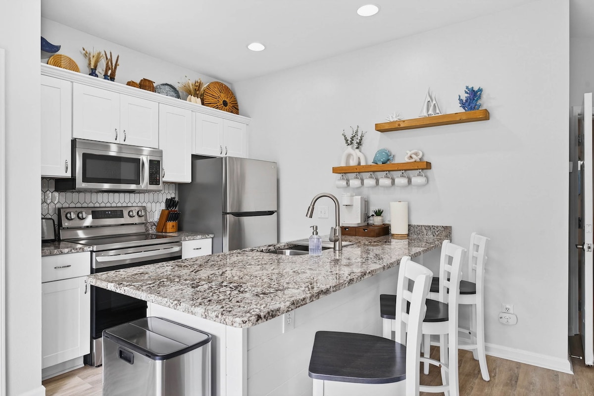We've created a cozy, beach-themed getaway nestled in an adorable neighborhood, just a short drive to the ocean. We redid the entire home with all new appliances, flooring, and amenities. It's decorated to help each and every guest feel at home at the beach. The home is within 5 minutes of Sunset Beach. 10 minutes to North Myrtle, Cherry Grove. Both Wilmington and Myrtle Beach are within 40 minutes. There are plenty of restaurants, grocery stores, and bars very near the home as well.