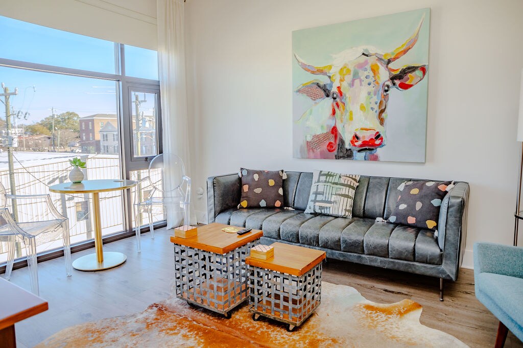 Esta lujosa suite de dormitorio tamaño king con balcón tiene grandes ventanales, decoración visualmente cautivadora y arte original, techos altos, una hermosa cocina completa con encimeras de cuarzo y electrodomésticos de acero inoxidable y mesa de comedor para 2 personas. ¡La sala de estar meticulosamente seleccionada tiene un sofá cama de cuero con colchón de espuma viscoelástica y una decoración única en todas partes! ¡El espacioso y lujoso baño cuenta con una gran ducha a ras de suelo! Juntos, la decoración de moda y el arte transforman esta suite en una visión cautivadora y