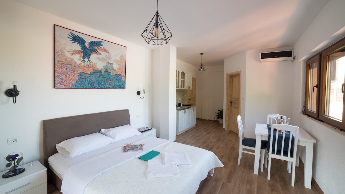 This, very modest little studio apartment, is ideal for single travelers or younger couples who are not looking for luxury and comfort,but rather prioritize a great location and budget travel.The greatest value of this listing is its location.Being able to wake up in the morning and make just a few steps to go for a swim, or to simply enjoy your time on a very nice little terrace while being surrounded by olive and laurel trees is what gives value to this tiny studio.Please read the description!