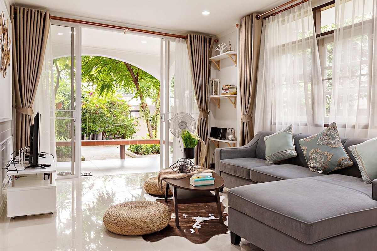 Disfruta de tu estancia en el centro de Bangkok en este acogedor y elegante lugar. Una casa de 160 metros cuadrados, recién renovada, que ofrece a grupos y familias un espacio agradable. Cuenta con todo lo necesario para que te sientas como en casa, incluyendo 1 cama tamaño queen, sala de estar (sofá cama), 2 baños, wifi, Netflix, lavadora y secadora, espacio de trabajo y una cocina bien equipada. A solo 5 minutos a pie de la estación de metro Ratchadaphisek. Fácil acceso a 7-11, bonitas cafeterías y mercados famosos como Jodd Fair, el mercado de Chatuchak, etc.