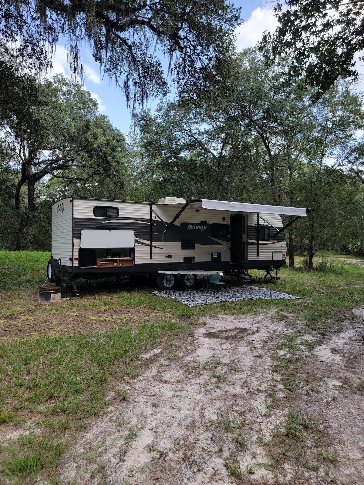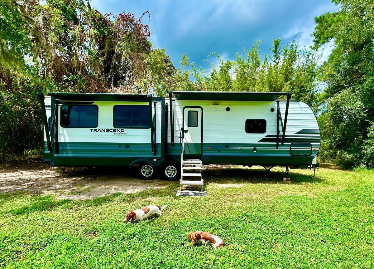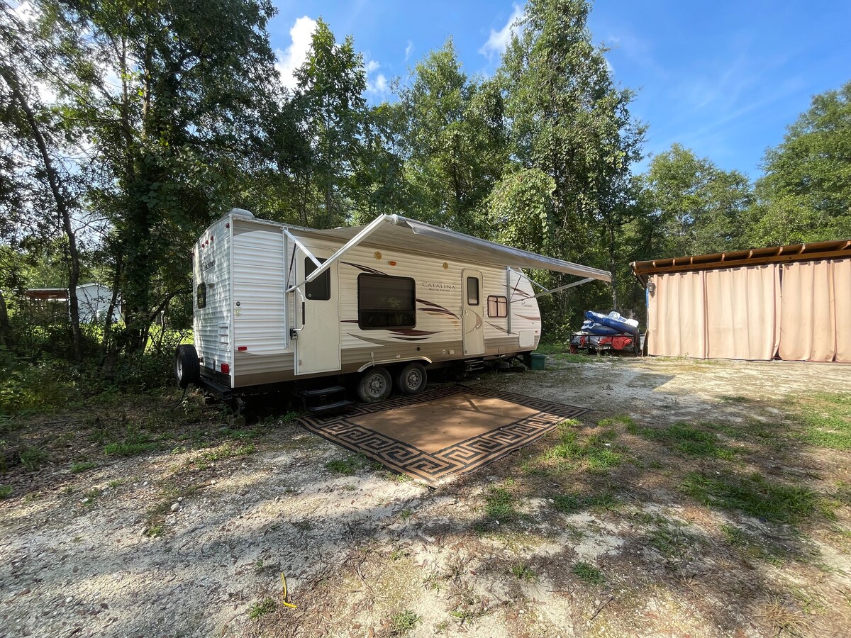 Wifi now available. Reconnect with nature at this unforgettable escape. 10 acres with 800' on the Historic Suwannee River with a 20' floating dock to enjoy the river life with out the crowds. Phase 1 of raised boardwalk complete, now walk from the camper over to the dock in a few minutes.. Come get away from the crowds 3 miles down a private road where the only traffic you will see will be on the river. Bring your boat, kids and pets. Camper is a 2016 Avenger.