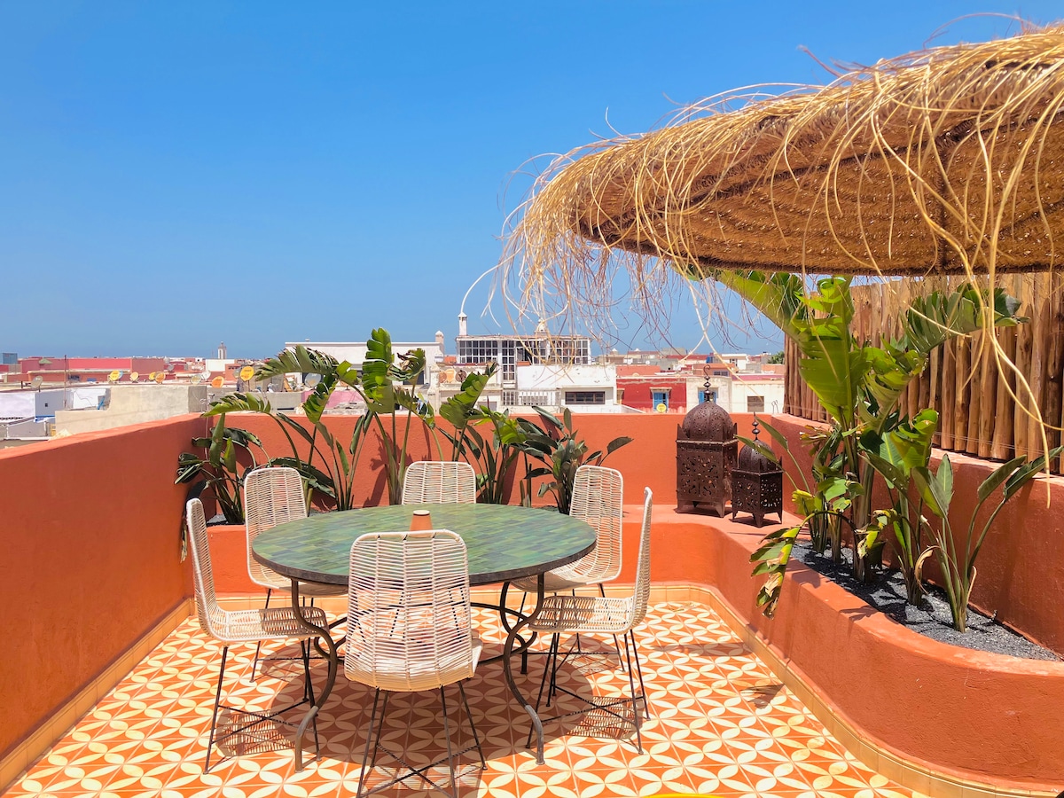 ¡Este alojamiento único, a la entrada de la medina, es uno de los apartamentos con terraza más bonitos de Esauira! ¡La planta superior y la terraza privada se encuentran en la parte más alta del barrio de Méchouar (casa construida en 1835)! Este «loft» de 140 m² está ahora a disposición de los viajeros privilegiados que lo reserven. Terraza amueblada y vistas panorámicas de 360° cerca de todos los lugares de interés y comodidades, lo que facilita la planificación de su visita a Esauira.