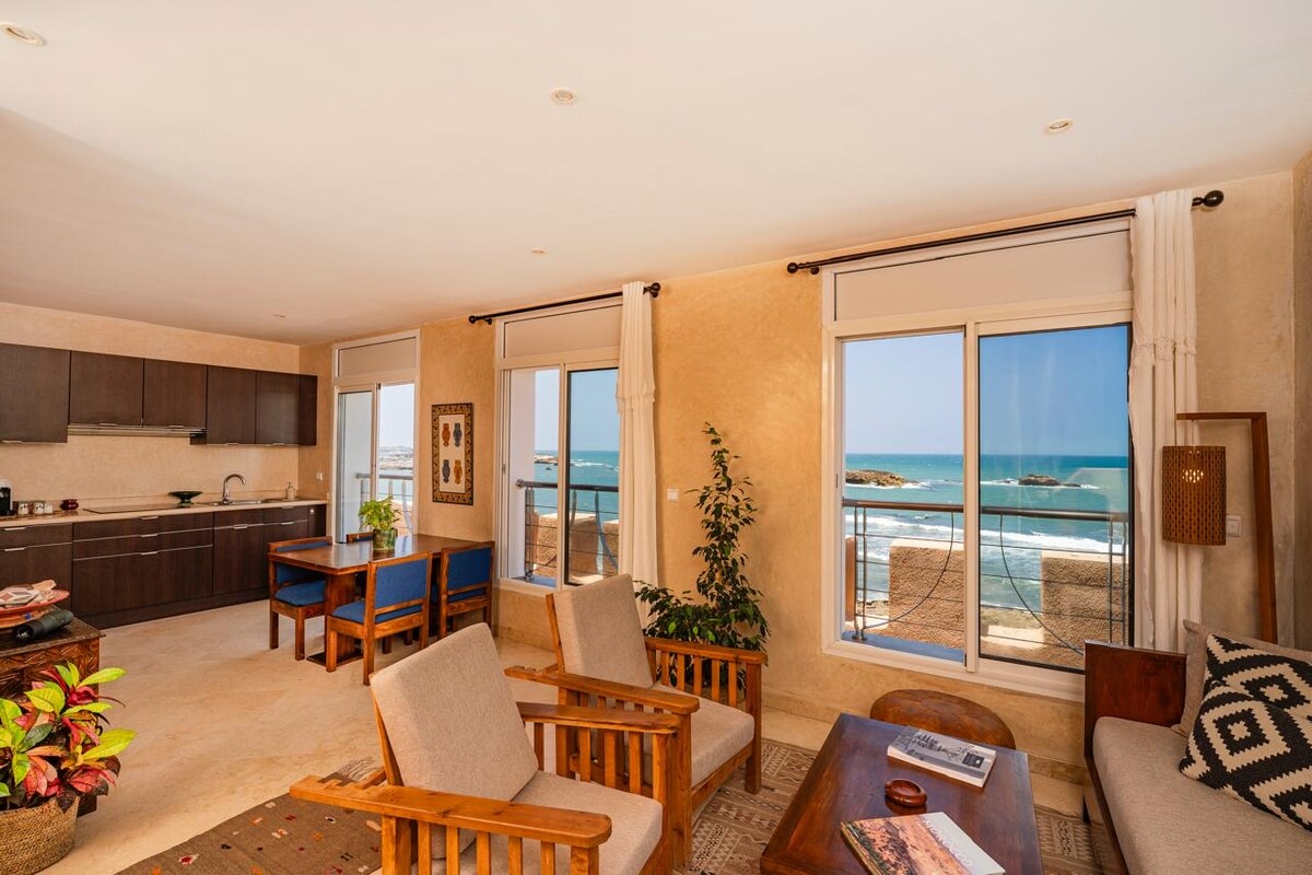 Esta joya, en la segunda planta en primera línea de mar, forma parte del Residence Mogador Beach, con piscinas, jardines, aparcamiento y seguridad las 24 horas. Apartamento nuevo, silencioso, con vistas excepcionales a la playa, el océano y las islas de Essaouira. Bonita cocina, excelentes ventanas aislantes, dormitorio doble, dos baños completos, sofá muy grande que se convierte en la segunda cama. Es ideal para una pareja o una familia de 3 o 4 personas. Wifi con fibra rápida. Smart TV. Sin ascensor