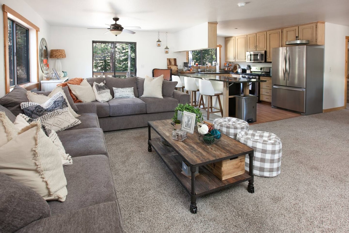 Newly remodeled with higher-end and modern designer touches, and a hot tub on the back deck! Single story and open-concept living area, chef's kitchen with higher-end gas range, larger dining table and extra seating at the breakfast bar, door opening up to fresh pines, large deck, and large open area for kids to play. Kids reading loft, bunk beds, arcade table, Smart TV's. Located in Tahoe Donner's resort neighborhood, guest access to pools, saunas, gym, and other amenities.
