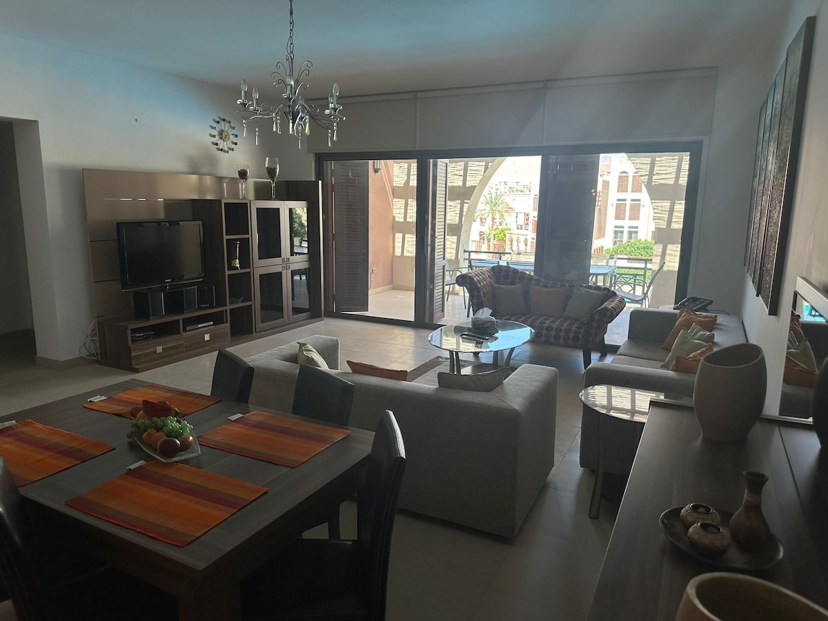 Moderno apartamento de lujo cómodo y limpio. Tiene 3 dormitorios y 2 baños ubicados en "TALA BAY RESORT AQABA JORDAN". Tiene dos accesos: uno de ellos a la playa y el otro directamente a la piscina y las terrazas. También tiene una gran sala de estar con su terraza y el apartamento está equipado con todo lo que puedas necesitar durante tu estancia, como cocina, comedor, TV, internet, lavadora y horno. Todo está completamente separado, ya que no hay espacios compartidos.