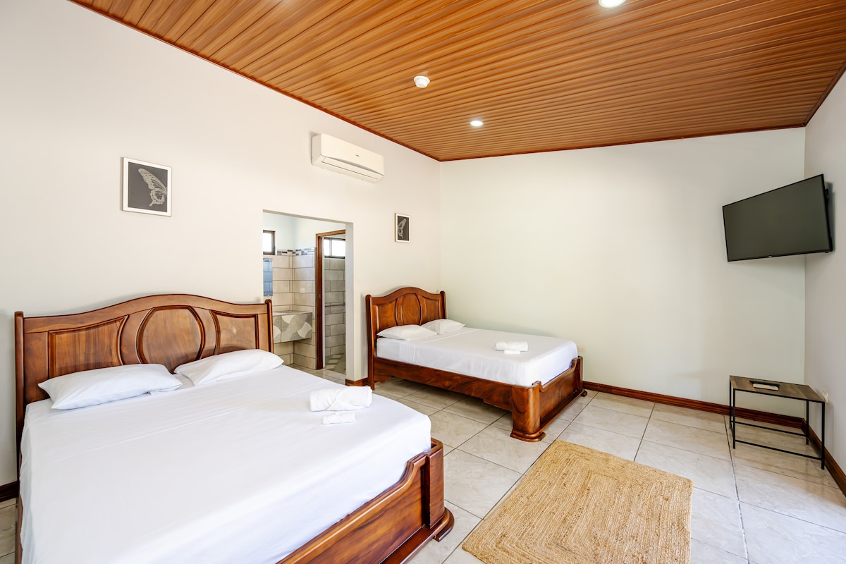 Imagina un lujoso refugio familiar ubicado en Potrero, Costa Rica, que ofrece un perfecto equilibrio de comodidad y sofisticación. La espaciosa habitación está adornada con acabados elegantes y naturales que reflejan el encanto tropical de la región, como detalles de madera de teca y una decoración suave en tonos de tierra. Una gran cama tamaño king se encuentra en la habitación, invitando noches de descanso después de los días de aventura. La habitación se enfría a tu preferencia con un aire acondicionado eficiente, lo que proporciona una escapada refrescante del cálido sol costarricense.