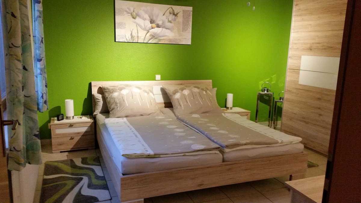 In the green surroundings near the forest with birdsong, enjoy the sun and sit outside on the wraparound balcony or downstairs on the brick terrace, parking in front of the gate, bus stop (line 35, or call taxi) to the city center diagonally opposite, 4 km to the center, 10-minute walk to the Käppele pilgrimage church with view, idyllic and centrally located, cyclists especially welcome, breakfast (available in the mini-fridge) and coffee preparation (comfortably inside or on the balcony)