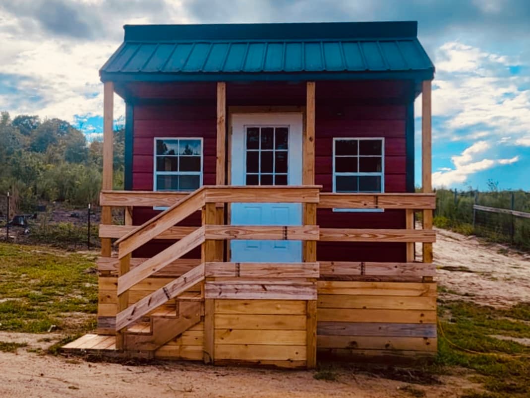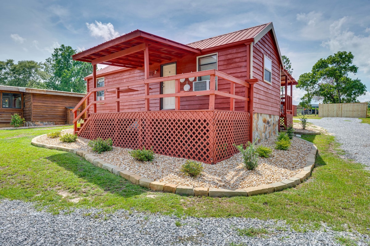 Relájate en esta adorable cabaña pequeña que está escondida en uno de nuestros pastos de animales. Viene completamente amueblado con un sofá cama tamaño queen, cama con sábanas proporcionadas junto con un baño completo y ducha. Tiene una cocina eficiente con refrigerador congelador, microondas, quemador individual, cafetera Keurig, o mejor aún, puedes asar a la parrilla en tu patio privado que está cubierto mientras ves las hermosas puestas de sol.