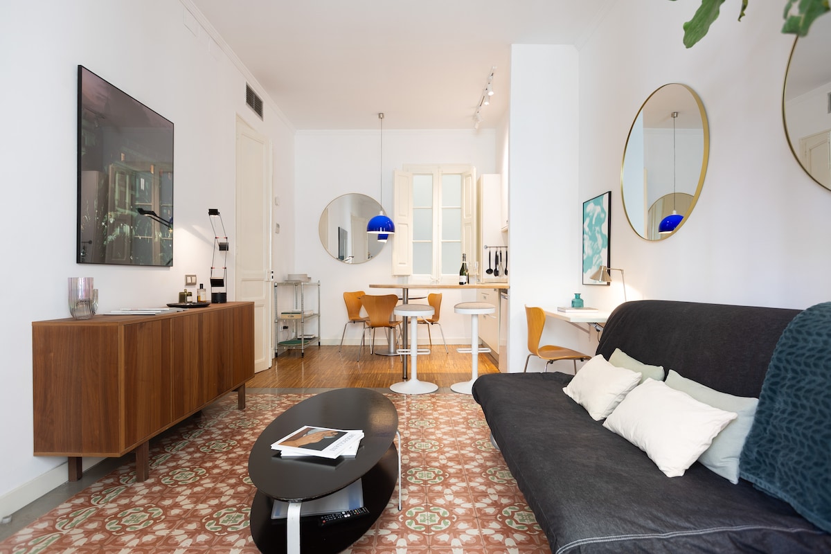 Welcome to our modernist apartment located in Barcelona's vibrant Mercat de Sant Antoni. Nestled in a beautifully refurbished historic building, we have preserved the allure of Modernist architecture: high ceilings, original tile floors. Very Quietly situated at the building's rear, it features a small private terrace. Modern amenities: equipped kitchen, central AC, high-speed internet, smart TV. Only 10-minute walk to the historical center. Direct metro access right outside.