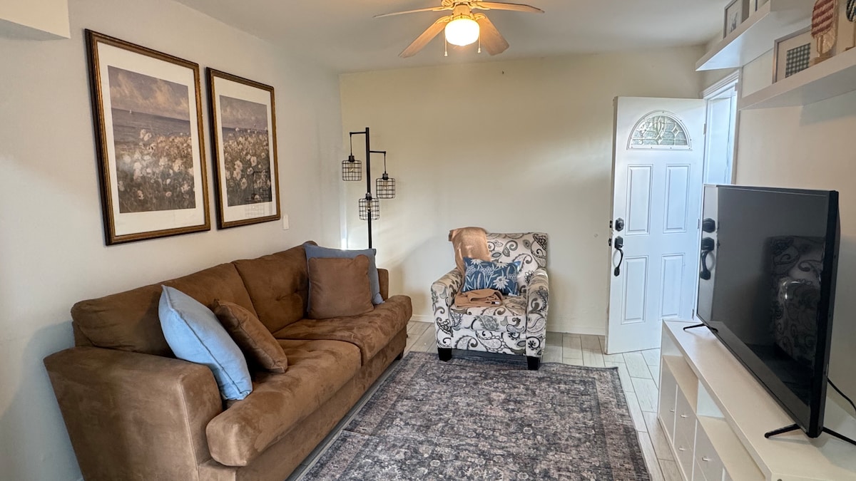 Tu casa fuera de casa, departamento ubicado en el centro de Tecate a un min. caminando del parque Miguel Hidalgo. Una cama queen, una cama individual y un fotón que se convierte en cama. AC y calefacción en recamara. WIFI, secadora de cabello, televisión inteligente, librero, café y básicos de cocina. Todos los servicios; cafés, restaurantes, tiendas, Iglesia y el parque a metros de distancia. Disfruta de las comodidades de casa, mucha luz natural, cocina completa, sala y comedor.