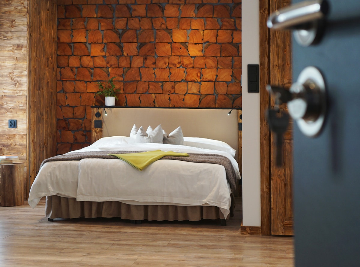 Vivís en una casa de madera independiente separada del resto del patio. Naturaleza pura. Desde la terraza se tiene una gran vista del paisaje montañoso y de prados. Allí también se puede disfrutar de las puestas de sol. El patio está a 25 m, donde también se puede utilizar el invernadero y el bar, así como la terraza del lago. La casa se calienta con una estufa de leña, que también abastece el piso superior a través de corrientes de aire. Para ello, hay que encender la chimenea.