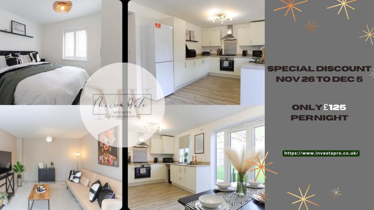 Un acogedor Airbnb que cuenta con una elegante cocina totalmente equipada, una gran sala de estar, tres dormitorios dobles y un cuarto dormitorio individual, todo amueblado con un alto nivel. El dormitorio principal tiene un baño privado, además de que hay un baño familiar y un inodoro en la planta baja. Ofrece dos plazas de estacionamiento gratuitas, un jardín delantero limpio y un gran jardín trasero privado. Wifi de fibra de alta velocidad y TV inteligente OLED de pantalla grande.
