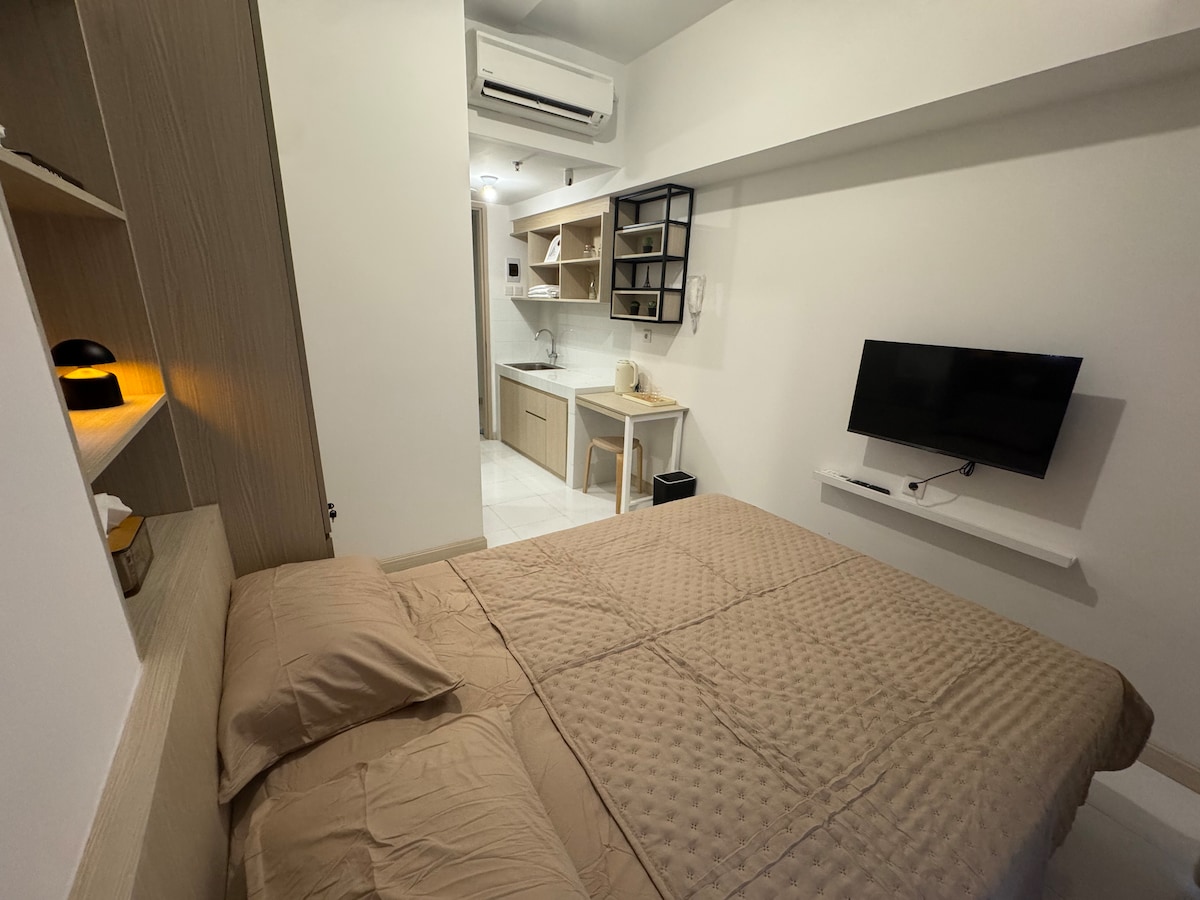 Cerca de JIEXPO y JIS, nuestro estudio en el apartamento Maplepark ofrece comodidad moderna, internet de alta velocidad y Netflix. El diseño de planta abierta cuenta con muebles elegantes, abundante luz natural y zonas de trabajo y dormitorios sin problemas. La cocina bien equipada y la lujosa zona de dormitorio garantizan comodidad y practicidad. Con fácil acceso a tus eventos y un balcón privado con vistas a la piscina, este estudio combina la sofisticación urbana con un encanto acogedor, lo que lo convierte en el hogar perfecto en el corazón de Yakarta.