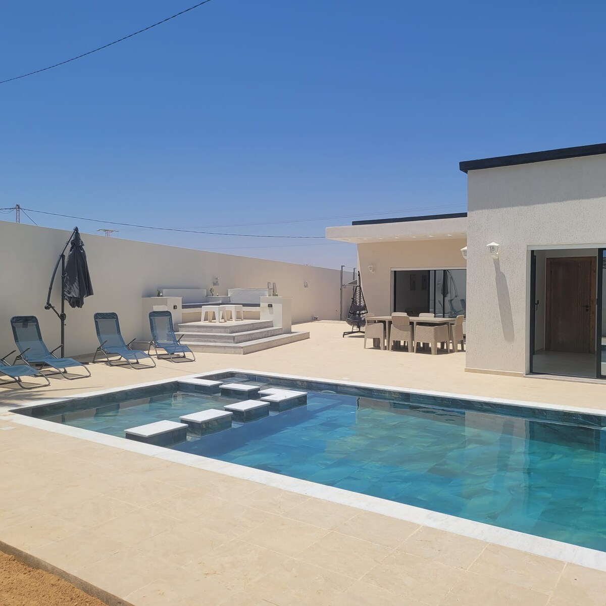 Bienvenido a nuestra villa sin vecinos orientada al sur, en una zona tranquila Cuenta con una gran piscina privada, una piscina infantil, una gran sala de estar, una cocina equipada, una zona de pérgola para relajarse, una barbacoa, una zona acogedora... Hay juegos de mesa disponibles para entretenerse A 200 m de la mezquita, y en coche: a 2 min del supermercado, a 5 min de la playa y a 15 min del centro de la ciudad de Midoun y del centro comercial Bourgo Mall El coche es muy aconsejable