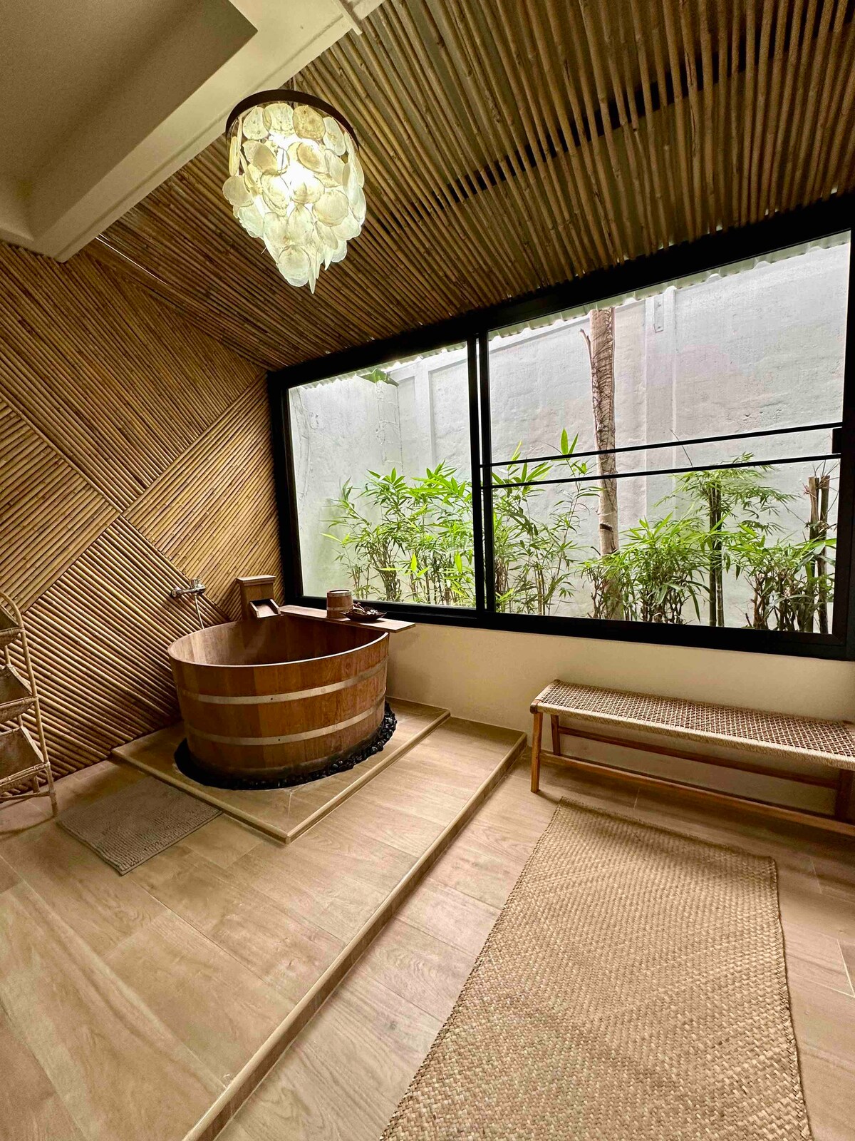 Esta hermosa unidad de 55 metros cuadrados de inspiración japonesa cuenta con todo lo que necesitas para una estancia agradable. El dormitorio tiene una cama tamaño king y un espacio de trabajo personal, y se abre a un espacioso baño semi exterior con una bañera de madera ofuro que se adapta a dos, y conduce a un gran vestidor. La sala de estar incluye un acogedor sofá cama y un televisor inteligente Ultra HD. La cocina está bien equipada con microondas, campana extractora, vitrocerámica y refrigerador. La gran ventana panorámica ofrece una vista a los jardines y a la piscina.