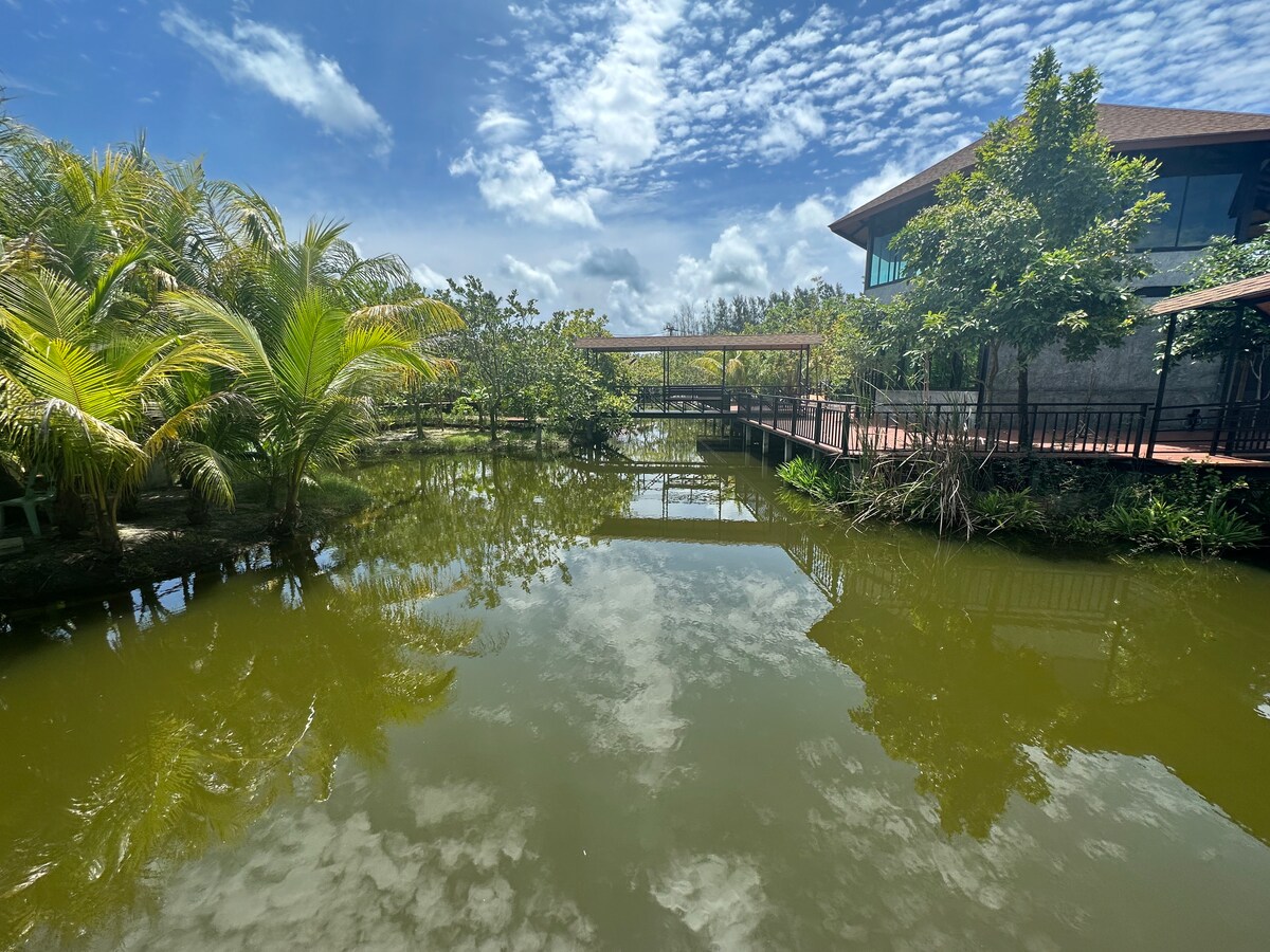 Un chalet tranquilo y acogedor junto a un canal Klongnoy rodeado de vegetación tropical, vistas increíbles. Un verdadero santuario privado para que te desconectes de los ruidos ocupados del mundo. El huésped tiene acceso total a aprox. 8000 metros cuadrados. La casa puede alojar hasta 4 personas con 2 camas tamaño queen con sábanas y almohadas y baño limpio. Internet fijo, microondas, mininevera y bicicletas están disponibles.