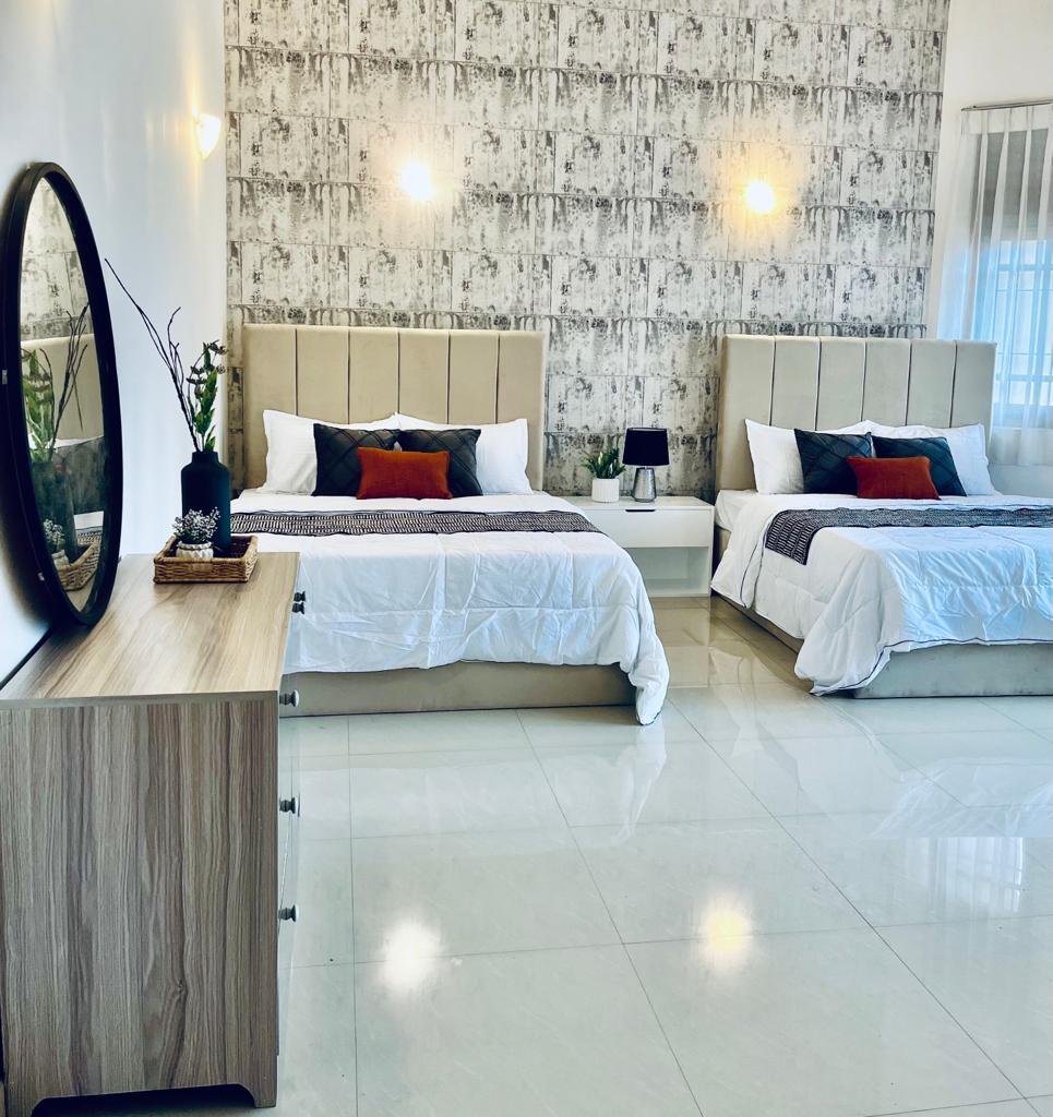 ¡Bienvenido a nuestro moderno apartamento! Alójate en este elegante alojamiento con todas las comodidades de lujo. Apartamento en el cuarto piso, cuenta con una amplia sala de estar y comedor, cocina totalmente equipada y dos acogedoras habitaciones con baño privado y balcones. Lavadora/secadora para lavar tu ropa. Aparcamiento privado, ascensor, azotea panorámica y gimnasio totalmente equipado. Descansa tranquilo con seguridad las 24 horas. Convenientemente ubicado cerca de supermercados, restaurantes, pistas para correr y hospitales. A poca distancia de la entrada de la autopista.
