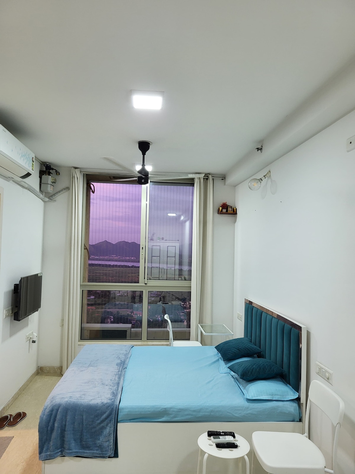Estudio de lujo con un interior acogedor en la urbanización Hiranandani, con impresionantes vistas al arroyo y a la montaña.Prestaciones • Se admiten parejas • Cama tamaño queen con sábanas y almohadas de lujo • TV inteligente, wifi de alta velocidad y aire acondicionado. • Cocina americana totalmente equipada con nevera, hervidor y utensilios. • Baño moderno con grifería de primera calidad y agua caliente. • Balcón privado con vista panorámica • Seguridad 24/7, ascensores y acceso seguro. Ideal para viajeros solitarios, parejas, huéspedes de negocios o familias pequeñas.