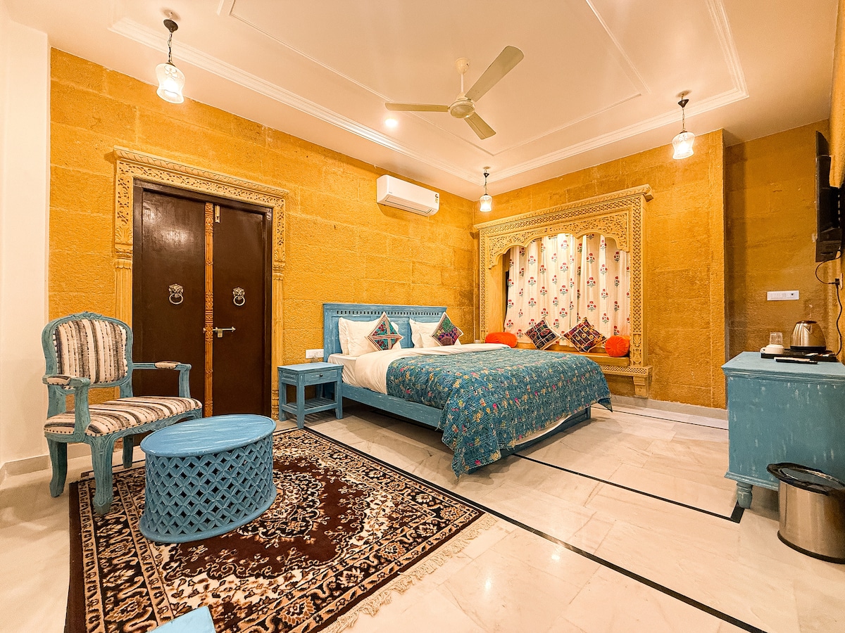 Step into timeless royalty at Sonar Suite, a beautifully crafted heritage room located just moments away from the iconic Sonar Fort of Jaisalmer. Designed in true haveli style, this suite blends the charm of Rajasthan’s rich architectural legacy with the comfort and convenience of modern living—offering guests an unforgettable stay in the heart of the Golden City.