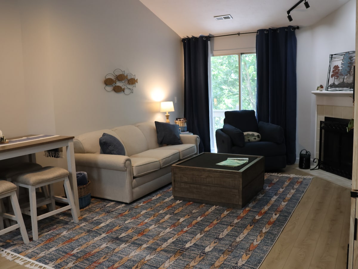 ¡Te damos la bienvenida al recientemente remodelado Cozy Condo! Te espera café, una canasta de golosinas, terraza privada y un columpio en el porche. Disfruta de los ciervos, el bosque y el enorme campo de golf. Hay una tienda Pro-Golf, pickleball, restaurante y bar Eagle Pointe, una piscina enorme, una terraza enorme, cabaña y, en su mayoría, bandas de fin de semana de verano a poca distancia del condominio. Solo 10 sencillos pasos hasta el condominio. Los precios se extienden solo hasta 2025. ¡Sería un honor ser tu Superanfitrión!