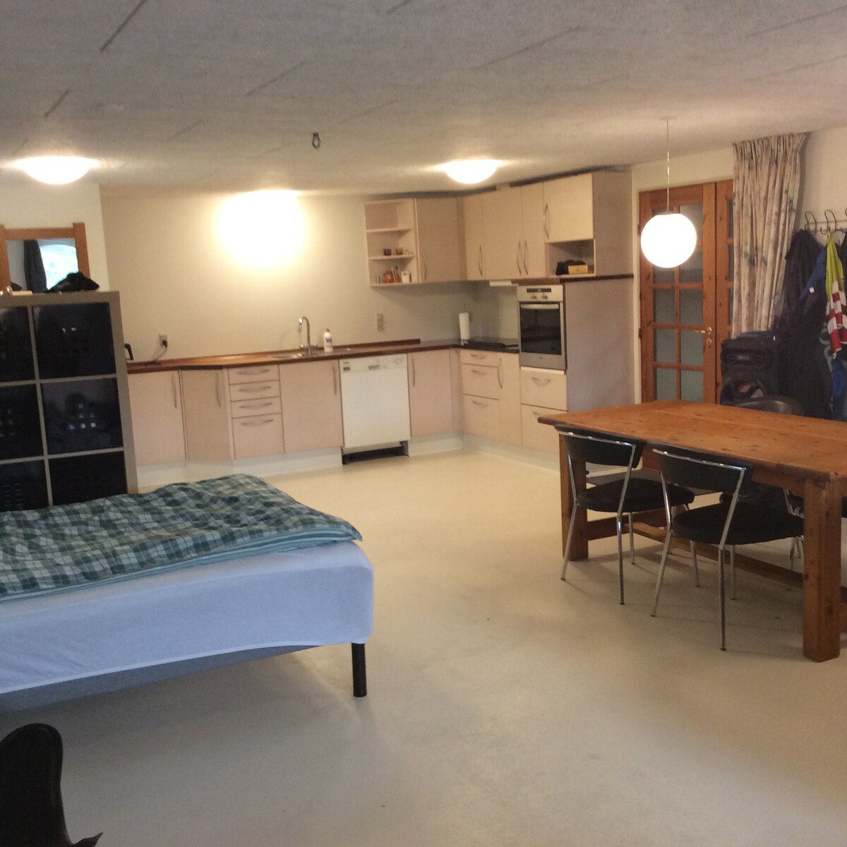 Lejligheden ligger i kælderen i vort hus. Der er egen indgang gennem haven. Havestien er godt oplyst om aftenen.Vi har valgt en huleagtig stil, da vi synes det passer til rummene. I køkkenet er der køleskab med lille fryser, to kogeplader og elkedel. Nørrealle er en befærdet gade, men der er ikke støj fra trafik eller naboer. Vores have ligger ned til et kolonihave område