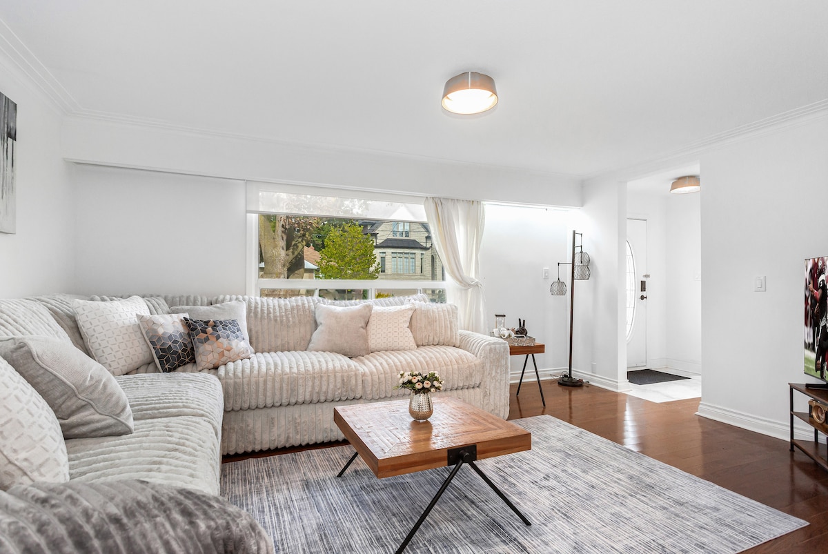 ¡Apartamento totalmente renovado, moderno, luminoso, lujoso y espacioso (más de 1800 pies cuadrados) de 2 dormitorios, 2 baños, techo alto, entrada independiente y patio para tu próximo hogar acogedor lejos de casa! ¡Con valoración de 5 estrellas y entre el 5 % de los mejores alojamientos en AirBnB! Lo más céntrico de la zona metropolitana de Toronto. Estarás cerca del aeropuerto de Pearson, la autopista 401/404/407, centros comerciales, tiendas de comestibles y una gran variedad de restaurantes de moda, cines, parques y rutas de senderismo/bicicleta por todas partes. ¡Reserva con confianza!