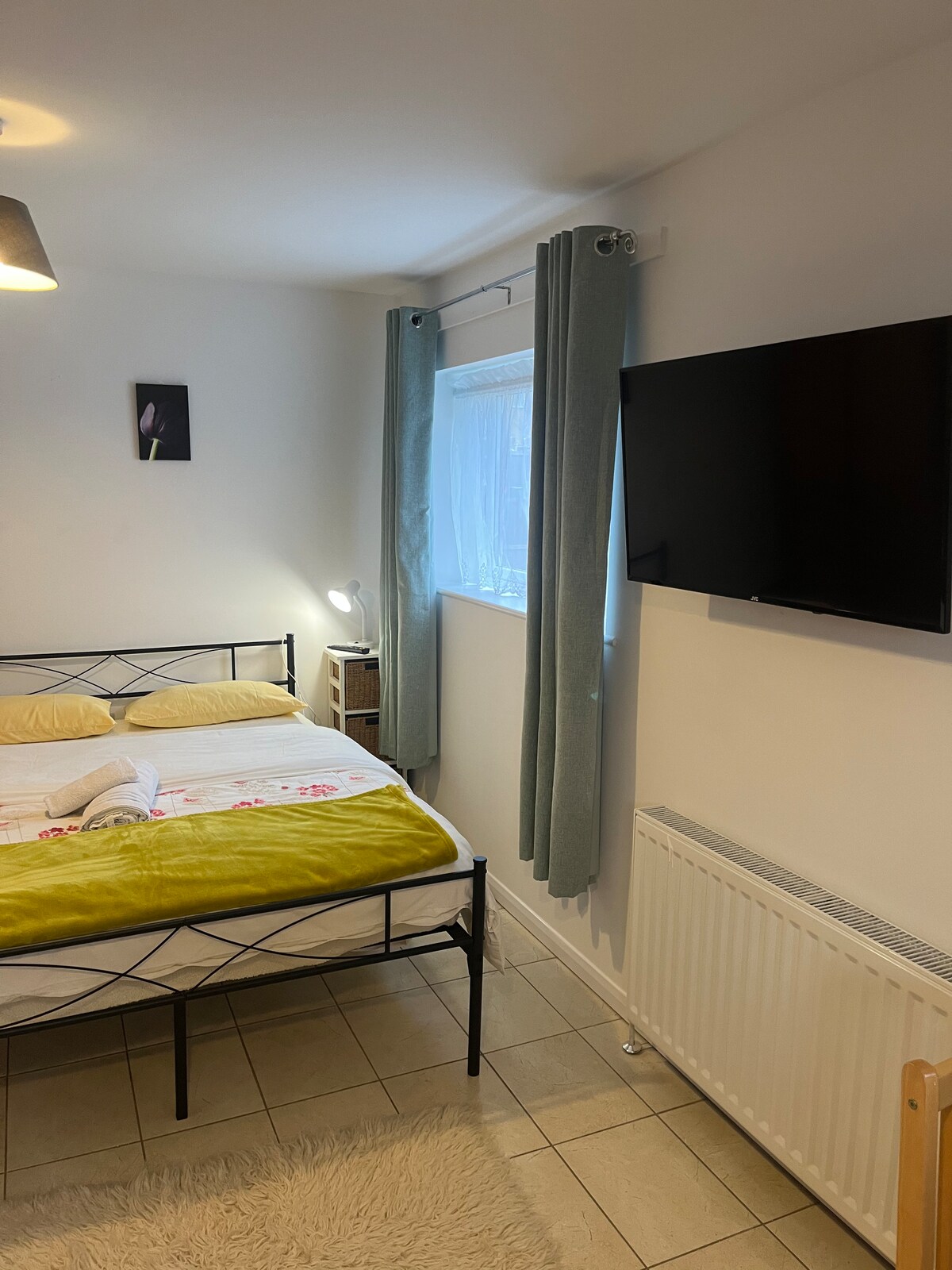 Un anexo autónomo construido en el lateral de una casa familiar. Planta baja. Situado en un pequeño cierre con estacionamiento en la calle. TV, nevera, microondas, freidora de aire pequeña, mini horno de encimera, hervidor y tostadora, baño privado, cama doble. A 5 minutos en coche del enlace M1 / M25. A 5 minutos a pie de un complejo de ocio que cuenta con 8 pantallas de cine, una pantalla imax, escalada interior y espeleología y varios restaurantes de marca. Polígono industrial a solo 5 minutos en coche o a 20 minutos caminando.