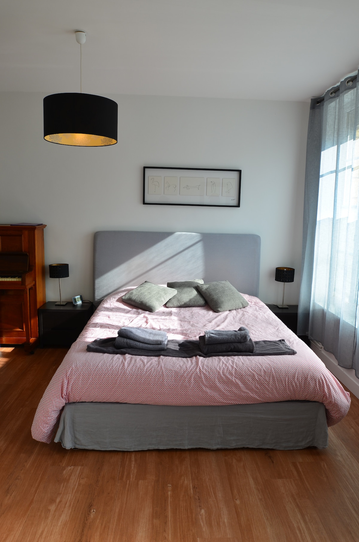 Cómodo y perfectamente equipado, nuestra habitación de huéspedes tiene una decoración cuidada. La habitación fue renovada en 2024. Hemos seleccionado materiales y muebles de calidad para crear un ambiente cálido y acogedor. La habitación es muy espaciosa y luminosa con una cama queen-size (160 cm, excelente ropa de cama), TV, nevera, Nespresso y hervidor de agua (con café, té y galletas). El baño está equipado con ducha (+gel de ducha y champú), lavabo, inodoro.